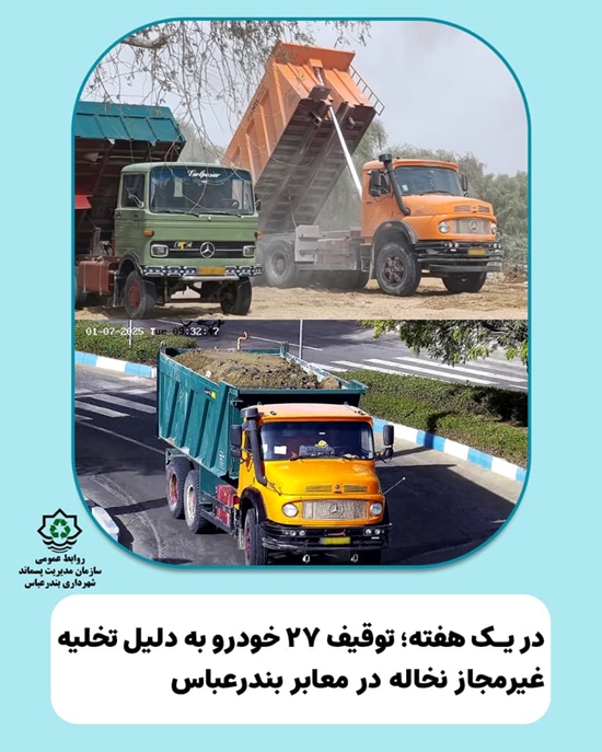رییس سازمان مدیریت پسماند شهرداری بندرعباس اعلام کرد: با استناد به ماده ۲۰ قانون مدیریت پسماندها، ۲۷ دستگاه خودروی حامل خاک و نخاله و ضایعات ساختمانی که اقدام به تخلیه غیرمجاز در سطح شهر کرده بودند، با پیگیری ها و اقدامات واحد حقوقی سازمان و به دستور مقام قضایی در طی یک هفته توقیف شدند.