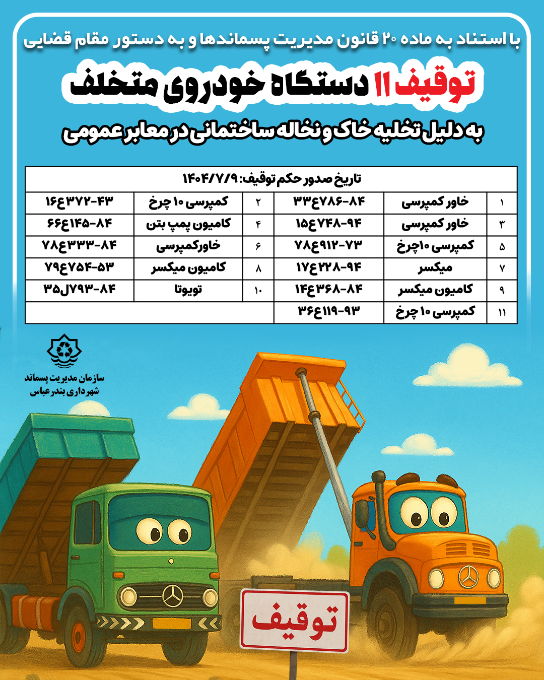 با استناد به ماده ۲۰ قانون مدیریت پسماندها و به دستور مقام قضایی، ۱۱ دستگاه خودروی متخلف به دلیل تخلیه خاک و نخاله ساختمانی در معابر عمومی، توقیف شد.
