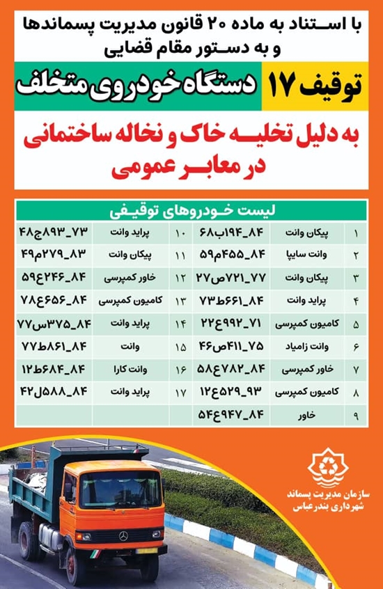 در ادامه پیگیری های واحد حقوقی سازمان مدیریت پسماند شهرداری بندرعباس در خصوص توقیف خودروهای تخلیه کننده خاک و نخاله ساختمانی در معابر عمومی این شهر، ۱۷ دستگاه خودروی متخلف دیگر نیز به استناد ماده ۲۰ قانون مدیریت پسماندها و با دستور مقام قضایی، توقیف شد.