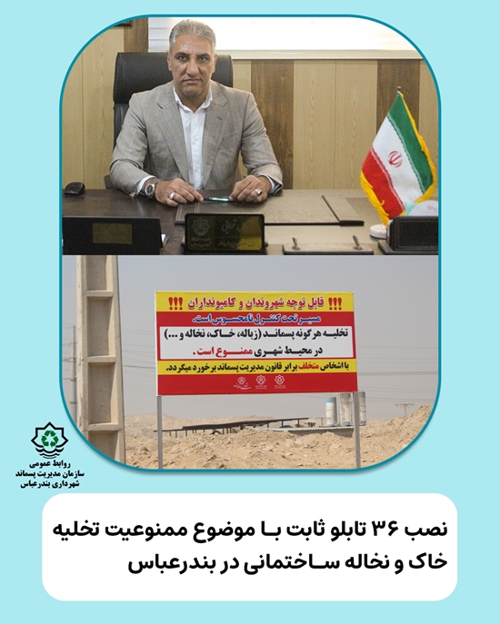 در راستای ارتقای سطح آگاهی عمومی و پیشگیری از تخلیه غیرمجاز نخاله‌های ساختمانی در سطح شهر، ۳۶ تابلو ثابت با موضوع ممنوعیت تخلیه خاک و نخاله ساختمانی در نقاط مختلف شهر بندرعباس جانمایی و نصب شد.