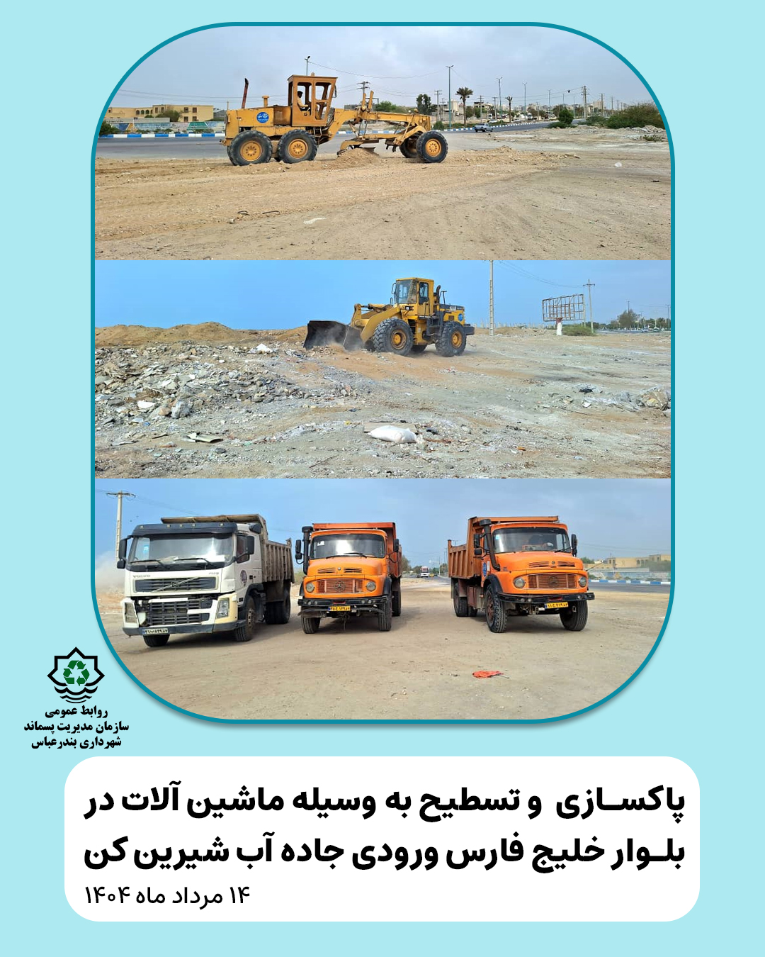 پاکسازی و تسطیح به وسیله ماشین آلات در بلوار خلیج فارس ورودی جاده آب‌شیرین‌کن